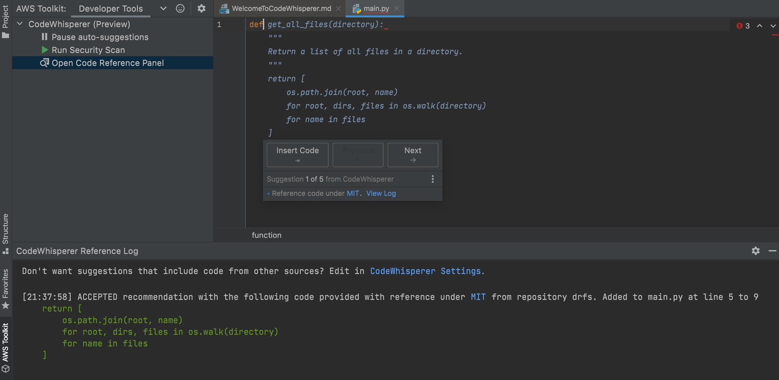 - CodeWhisperer emphasizes license reference tracking.